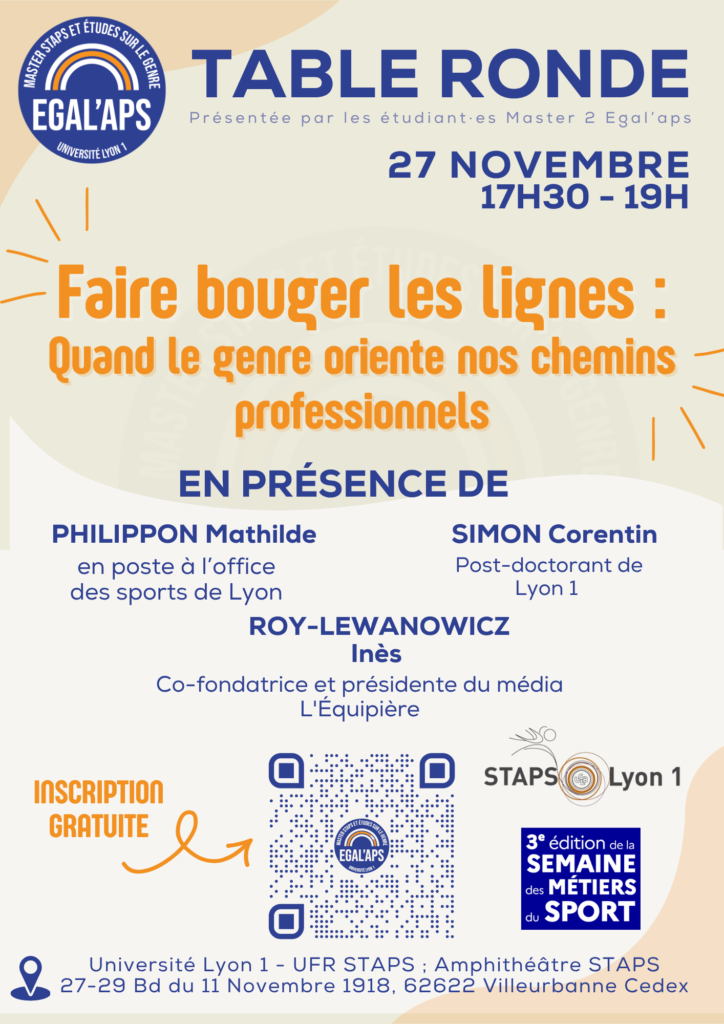 Les étudiant·es du Master 2 EGAL’APS (Égalité, Genre, Activité Physique et Sport) de l’Université Lyon 1 ont le plaisir de vous inviter à une table ronde autour des parcours inspirants de professionnel·les dont les trajectoires croisent les questions de genre et de sport.
